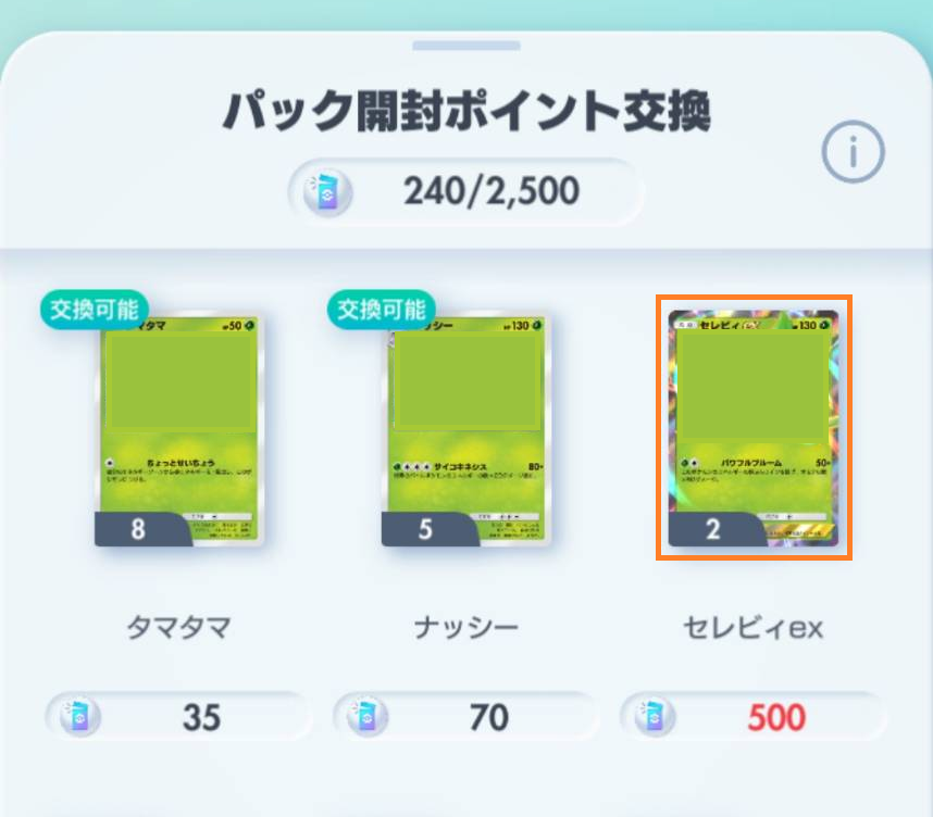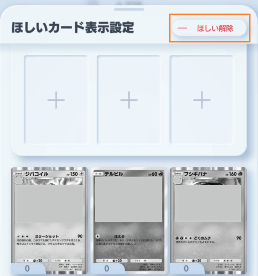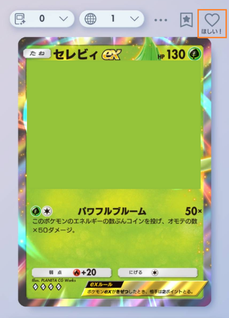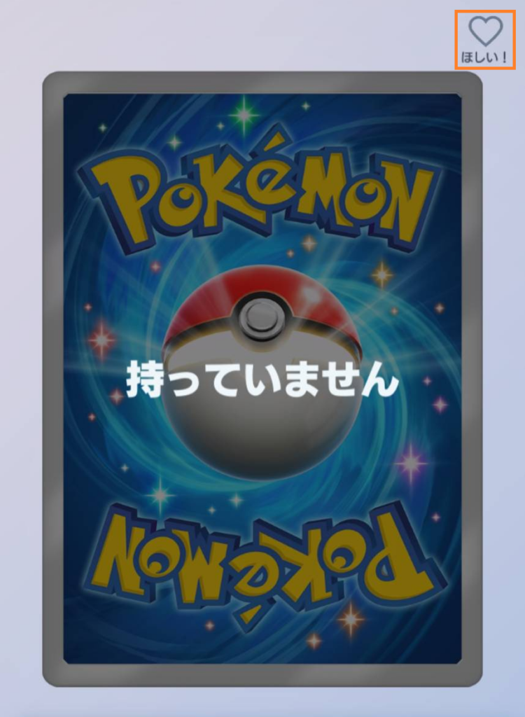 例えば、「セレビィex」をほしいカードに追加したい場合、選択・拡大・「ほしい!」をタップすると追加されます。カードを所持していない場合、「持っていません」と表示されます