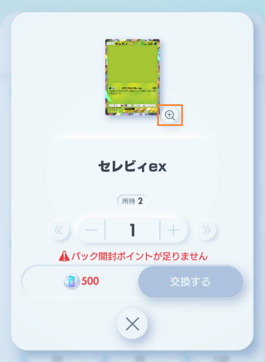 - 欲しいカードを選び、右下の「虫眼鏡+マーク(拡大)」をタップします。