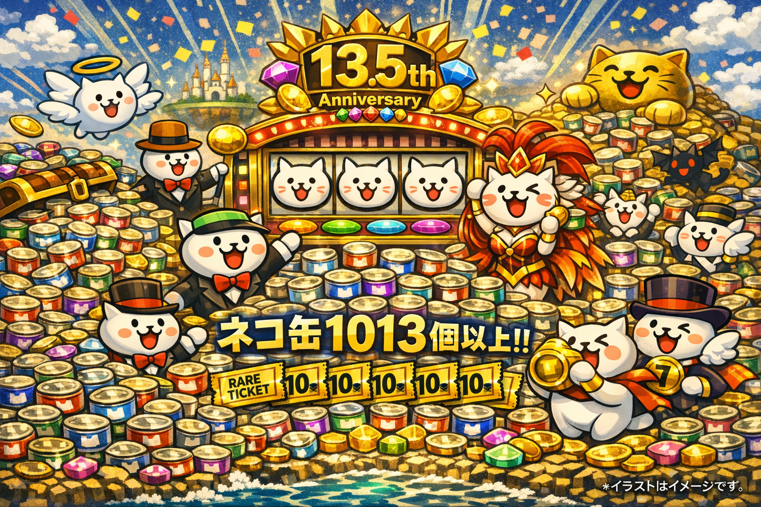 2026年5月22日まで開催される「13と1/2周年記念イベント」は、スロットでのネコカン配布やログインボーナスなど、まさに節目を祝う豪華な内容です。